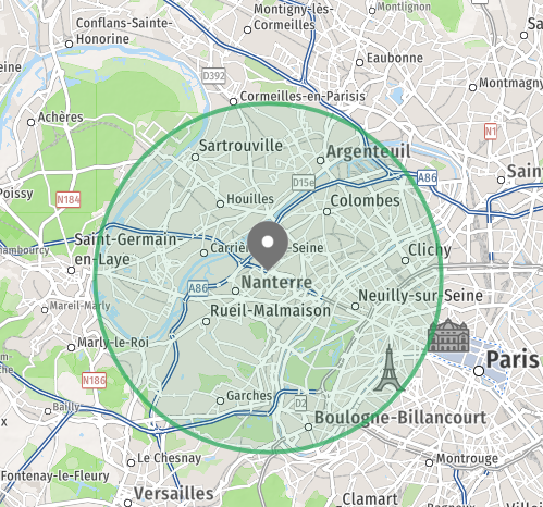 Je me déplace dans un rayon de 10 kilomètres autour de Nanterre donc dans Paris Ouest, Neuilly, Puteaux, Rueil, Colombes, La Garenne, Suresnes, Saint-Cloud, Garches…